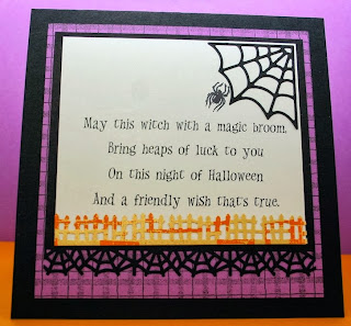 Back today with a Halloween card. Won't be long and all the little witches and ghouls and ghost will be knocking at our doors. OH may! I have a little yorkie, her name is Harli and she dresses up for the Halloween as well. Will post a picture of her all dressed up in a few days.
